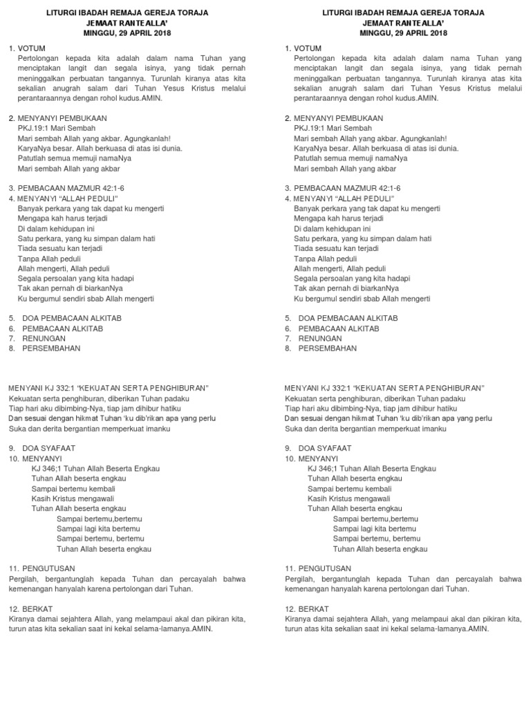 Kumpulan Renungan Dan Khotbah Bahasa Toraja from indonesiaterpercaya.net Check spelling or type a new query. We did not find results for: Maybe you would like to learn more about one of these?